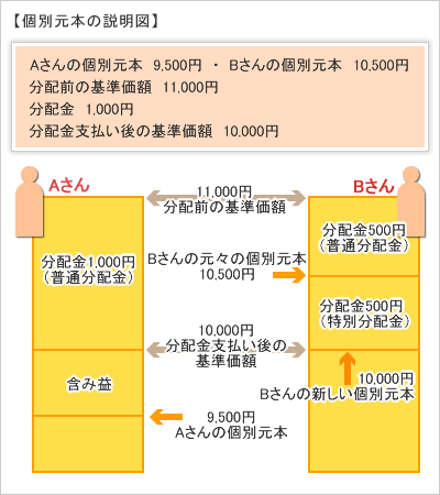 Bさんは10,500円で買った投信が値上がりして11,000円になっているものの、支払われた分配金1,000円のうち、本当の儲けは500円のみで残りの500円は自分が支払った元本の一部を返してもらっただけという事になります。この場合、本当の儲け分の500円が「普通分配金」元本の払い戻しに当たる500円を「特別分配金」と言います。特別分配金は、元本の払い戻しに当たるため、儲かっているわけではありませんから非課税となります。ここで、Bさんは分配金を1,000円もらっていますから、つまり、元本分の500円を分配金の一部として返してもらっていますので、新しい個別元本は10,000円になります。
