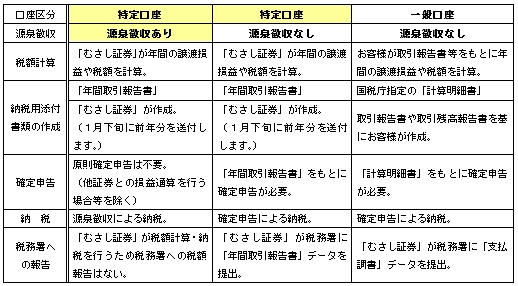 簡易申告口座と源泉徴収口座の2種類がある。簡易申告口座においては、特定口座年間取引報告書により、簡便に確定申告を行うことができる。